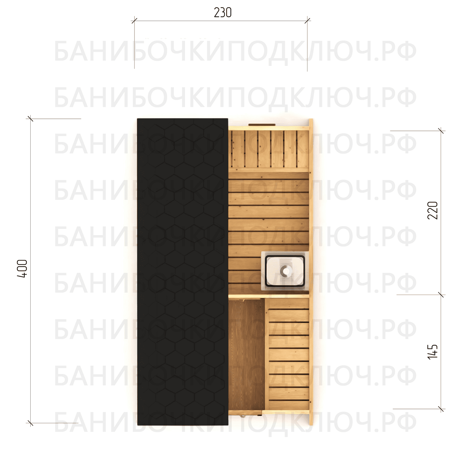 парилка - 220 см, предбанник - 145 см